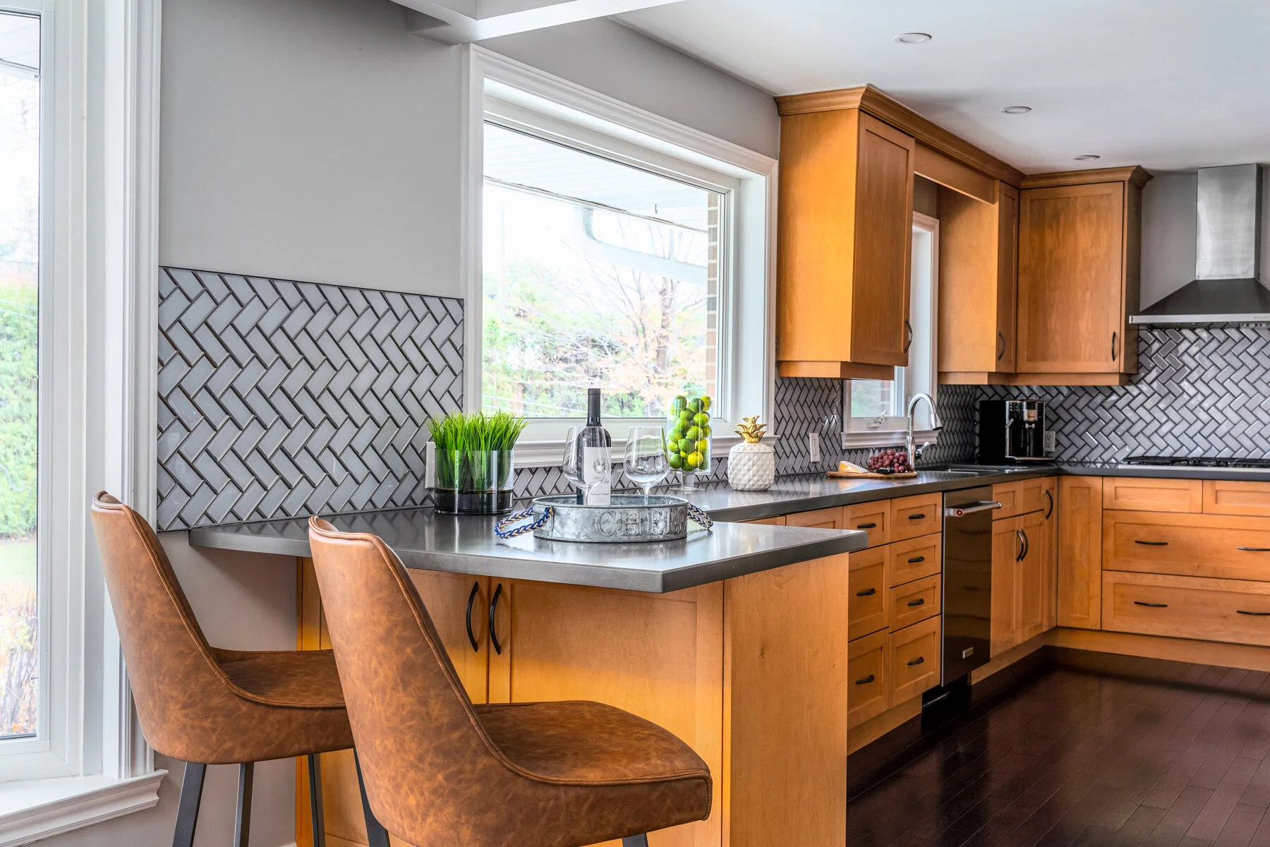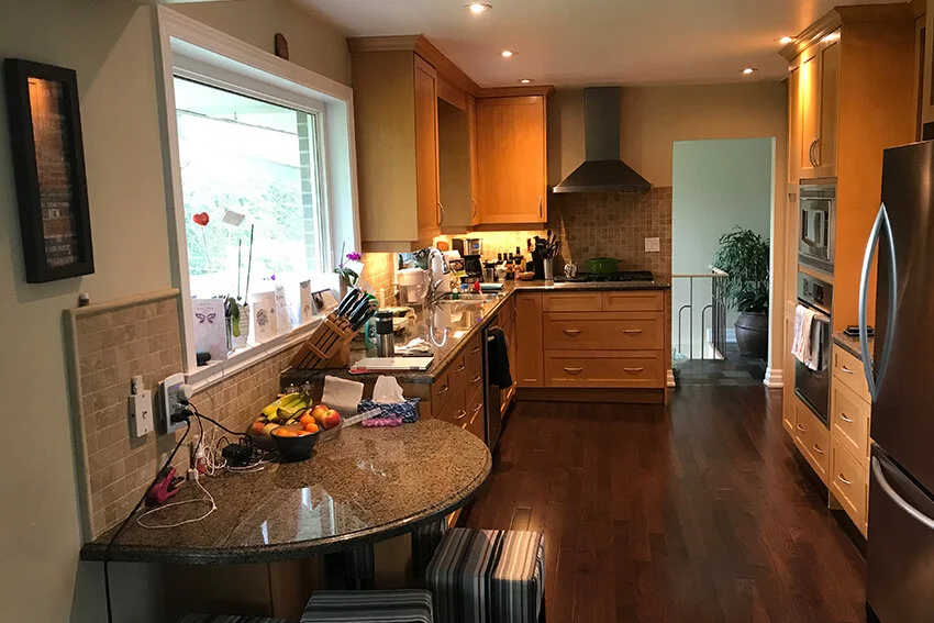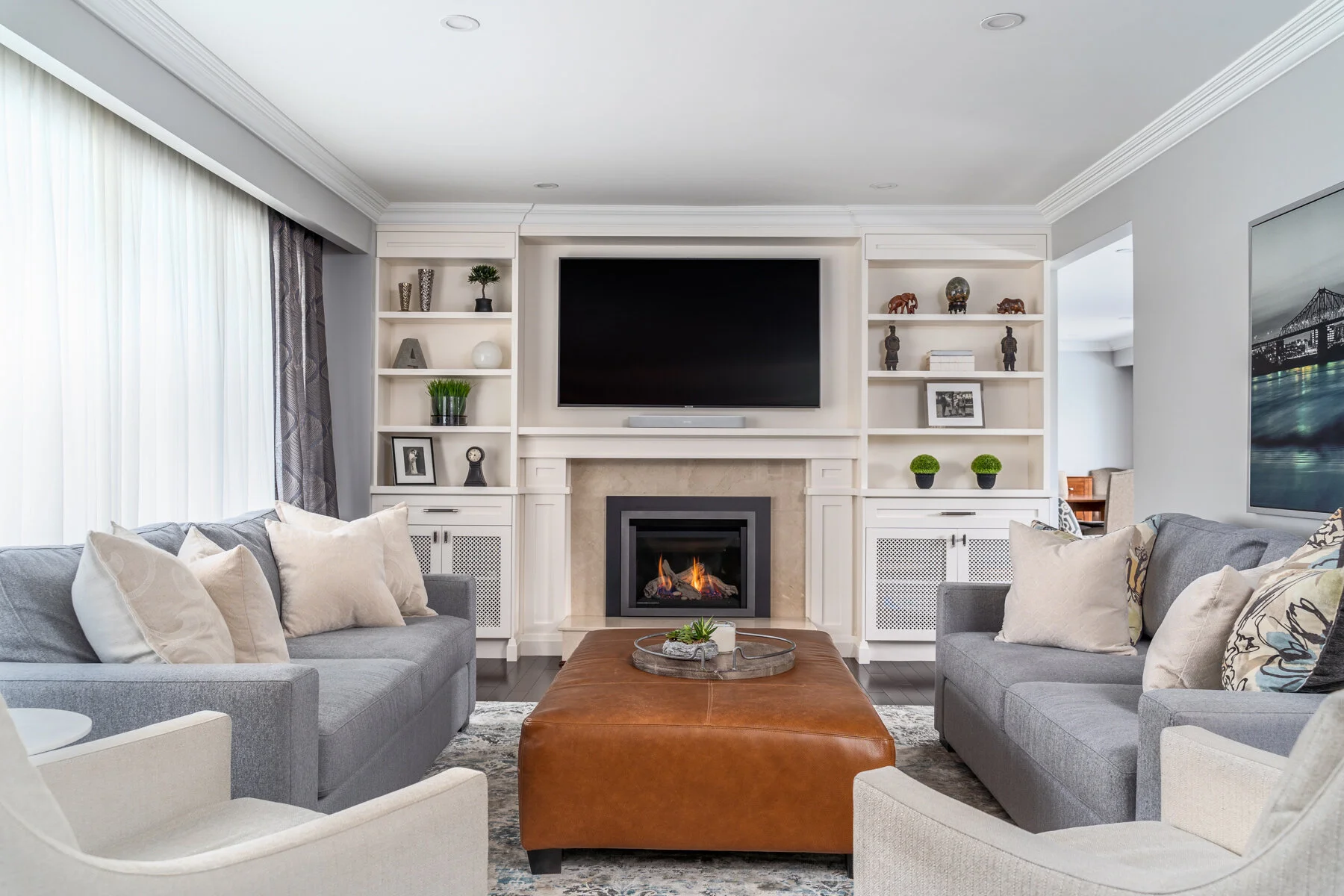 The goal for this project was to refresh the kitchen and living room, while retaining elements which the homeowners wanted to preserve. By adding a peninsula and cabinets, and replacing the countertops and backsplash in the kitchen, we improved function and created visual appeal. The custom cabinetry incorporated a new gas fireplace and TV, while furnishings transformed the living room into a space that easily doubles as a cozy room to watch movies with the family, as well as a sophisticated space for entertainment.